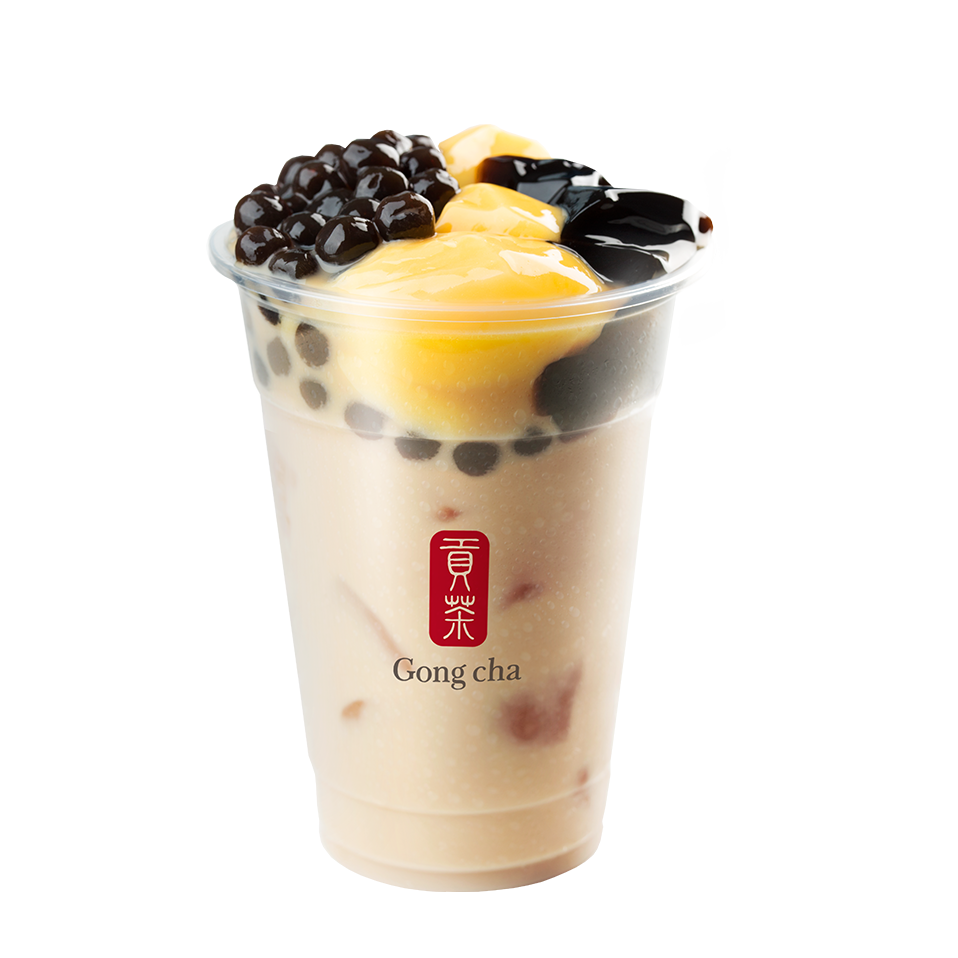 Trà sữa Oolong đậm đà được dùng kèm với trân châu dai dai, Pudding trứng béo ngọt và Sương sáo thanh mát.